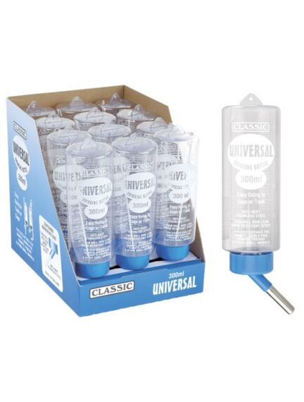 Universal drikkeflaske har et ophæng så flasken kan bruges til bure der har plastiksider og tremmer som låg. Der medfølger også almindelige ophæng så drikkeflasken også kan monteres på siden af buret.