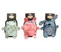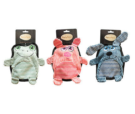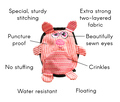 De er lavet af et slidstærkt stof med solidt kantbånd om som er syet med specialsting for at gøre det ekstra holdbart.. Fyldet giver en raslende lyd og i maven har det en squeaker som giver piplyde. Plysdyrene er ca. 20 cm lange og findes som frø, hund og gris.
