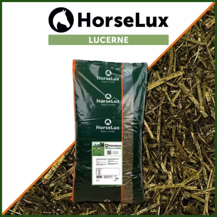 HorseLux Lucerne består af lucernehø, lucerne piller og Eponaolie. På den måde sikres et struktureret og fiberholdigt produkt, som samtidig er støvfrit.