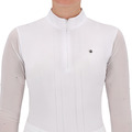 Konkurrencetrøjen med lange ærmer har strækbare mesh-ærmer udsmykket med rhinsten. Den tilbyder god komfort takket være det strækbare stof og har en skjult lynlås og en Q-nål på venstre bryst.