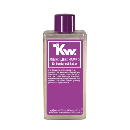 KW MINKOLIE SHAMPOO er særdeles velegnet til kort- og langhårede hunde og katte – også til glansløse pelse. Minkolien stabiliserer pelsens naturlige struktur og fedtindhold, samt gør pelsen skinnende blank og smidig med passende fylde.