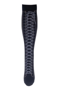Sorte ridestrømper med moderigtigt print i form af støvlesnøring er særligt hudvenlige og åndbare. De er perfekte til brug til hobbyhest samt i ridestøvler.