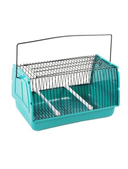 Transportkasse til fugle. I plast med gitter i metal. Med håndtag og siddepinde.