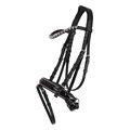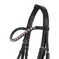 Lædertrense har en næserem i laklæder med en diskret glitterkant. Nakkestykket, næsebåndet og lukningen af næsebåndet er blødt polstret for ekstra komfort. Pandebåndet er udsmykket med hjerteformede rhinsten, der giver trensen et elegant look. Det anatomisk polstrede nakkestykke sikrer en bedre pasform og mere komfort til din pony.